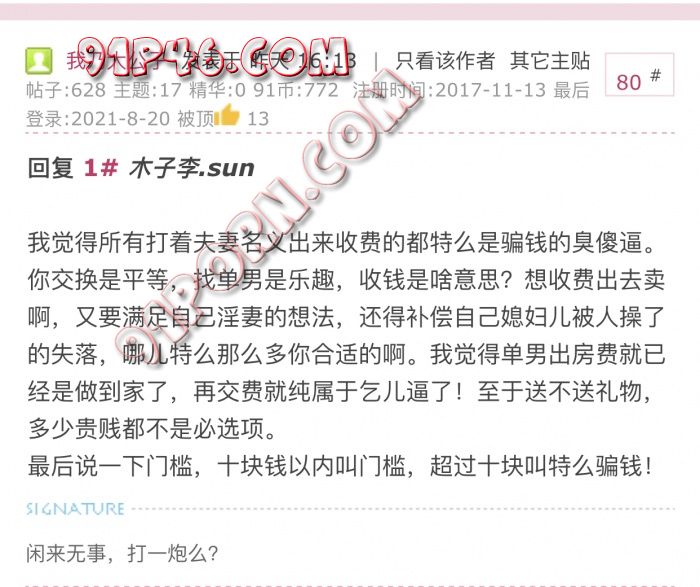 相信很多单男并不是骂收门槛的和有偿的真实玩的夫妻,而是骂那些借收门槛费和骗开房费等名义敛财却根本不玩的骗子